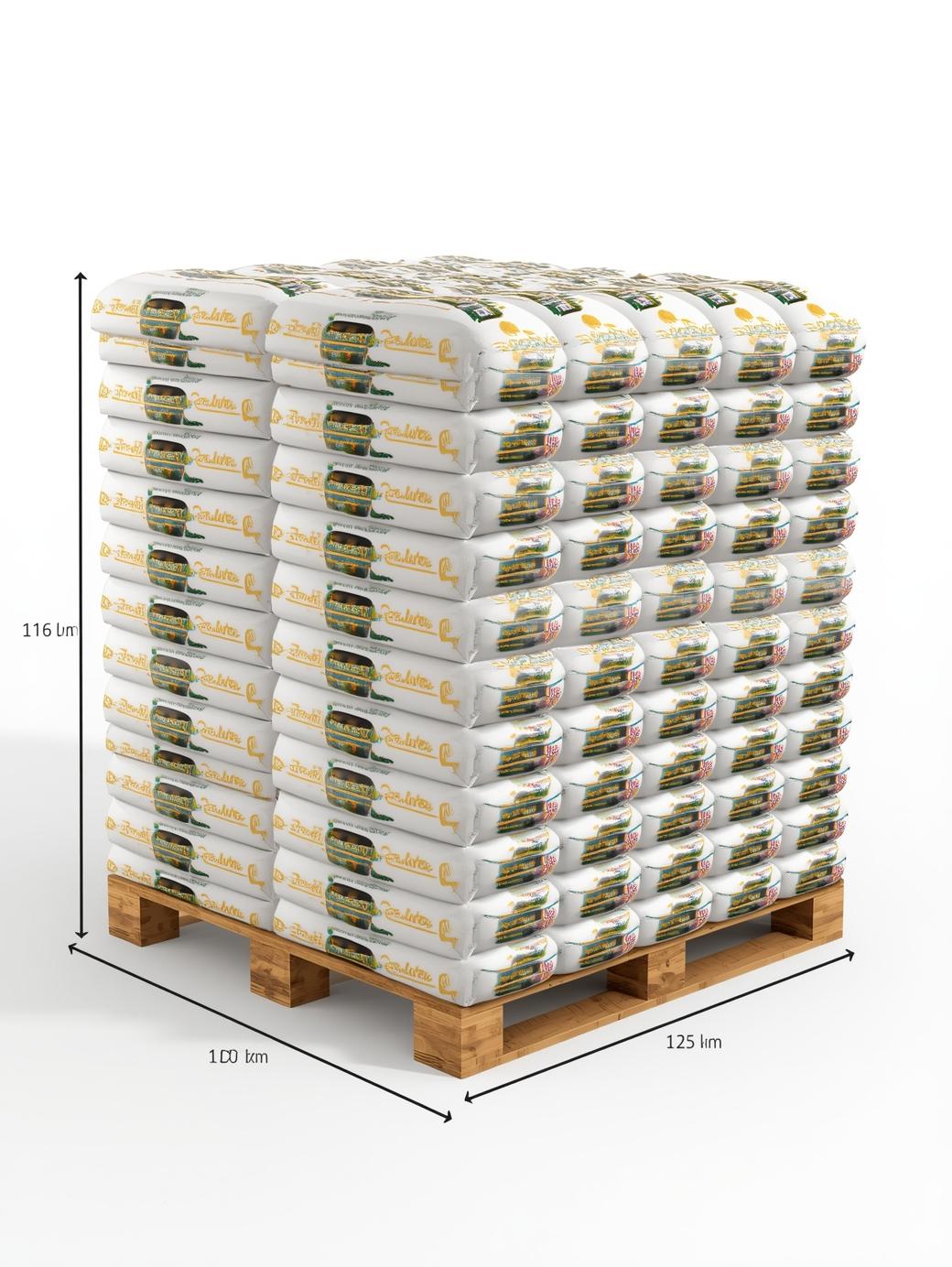 Každá paleta obsahuje 65 vriec po 15 kg, čo spolu predstavuje 975 kg kvalitného paliva s vysokou výhrevnosťou až 4,9 kWh/kg.